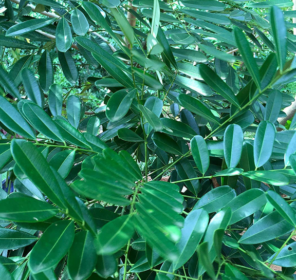 Compound, glossy leaves give the tree a tropical appearance. Small greenish-white flowers may appear seasonally and attract pollinators. Female trees may produce small black fruits enjoyed by birds.